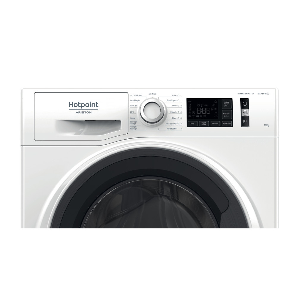 Ce lave-linge hublot posable Hotpoint présente les caractéristiques suivantes : très grande capacité de 10,0 kg. Classe énergétique B. Une vitesse d'essorage rapide de 1400 tours/min. Couleur blanche.