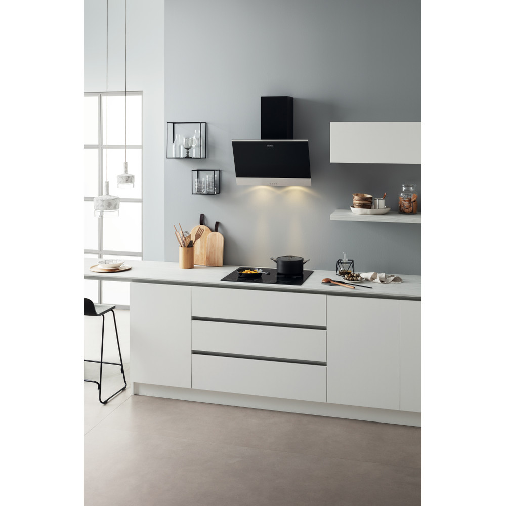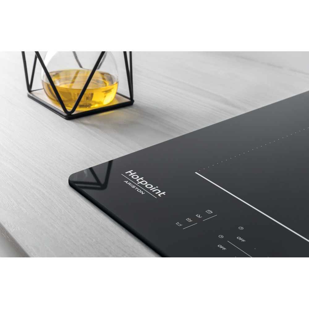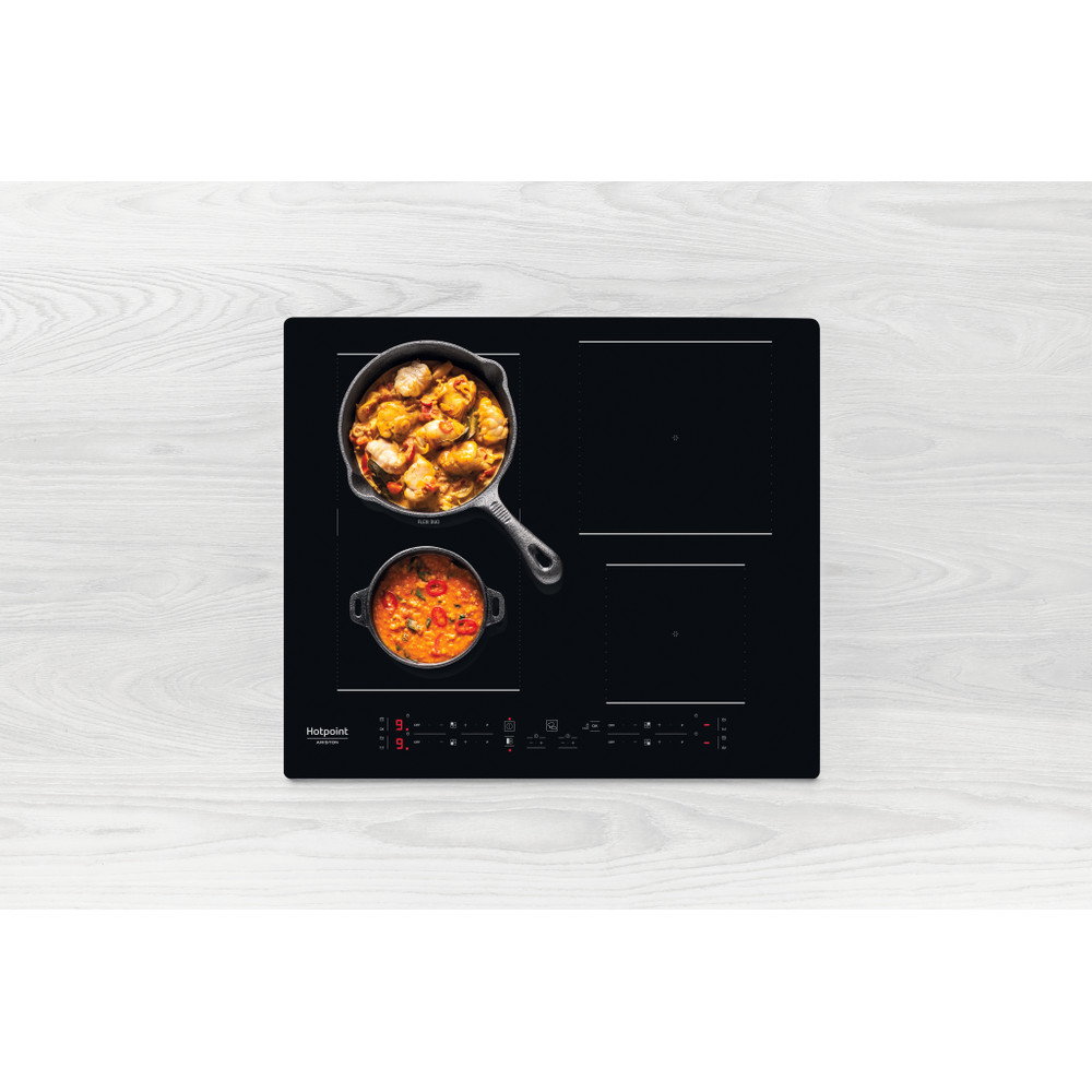 Table induction Hotpoint 60cm, 4 zones dont 1 flexible (2 inducteurs), 4 boosters, 3 fonctions automatiques, accès direct, 9 niveaux de puissance, 4 minuteurs, câble fourni, puissance totale 7200W.